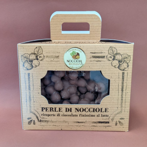 Perle di Nocciole ricoperte di Cioccolato al Latte, provenienti dai noccioleti biologici della nostra azienda, coltivate con passione. Varietà Tonda Gentile Romana
