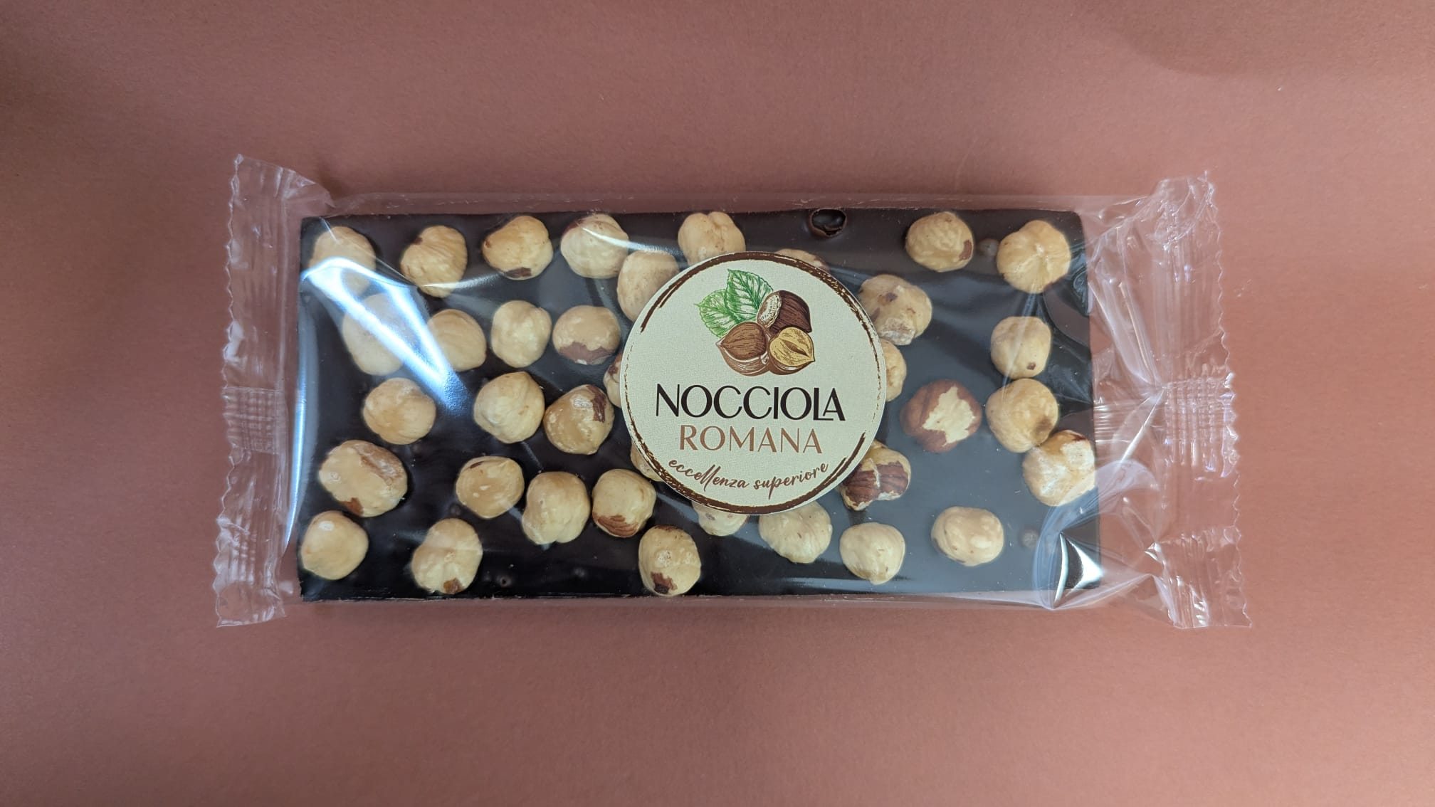 Tavoletta Cioccolato Fondente con Granella di Nocciole tostate, provenienti dai noccioleti biologici della nostra azienda, coltivate con passione. Varietà Tonda Gentile Romana